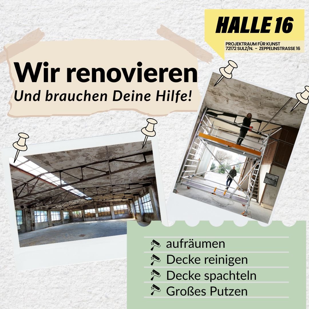 Du kannst die Halle 16 für deine künstlerische oder kulturelle Veranstaltung einfach reservieren. Klicke im Kalender auf deinen Wunschtermin und ein Fenster erscheint. Fülle alle Felder aus. Im Unterkalender kannst Du die gewünschte Veranstaltungsart festlegen (Veranstaltung, Ausstellung, Workshop, Offene Halle). Bitte beachte, dass außerhalb unserer Hallensaison keine Veranstaltungen stattfinden können.